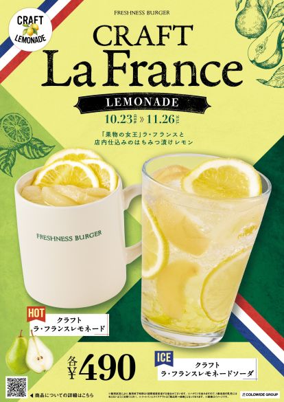 シリーズ通算50万杯以上を販売するクラフトレモネードシリーズより「果物の女王」と呼ばれるラ・フランスが初登場。店内でじっくりとはちみつに漬け込んだレモンと、ラ・フランスの果肉を使用。ラ・フランスと洋ナシシロップをバランスよく配合したオリジナルシロップの程良い甘みとレモンの酸味が爽やかな一杯です。フランスフェアとして、ハンバーガーやポテトと合わせてお楽しみいただけます。