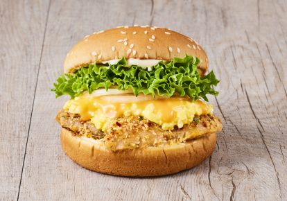 もう一つの新商品「銀だらグリエのフレンチバーガー スクランブルエッグとオマール海老ビスクソース」は、生クリームとバターでコクを出したふんわり食感のスクランブルエッグにオマール海老の旨みが詰まった濃厚ソースを合わせました。