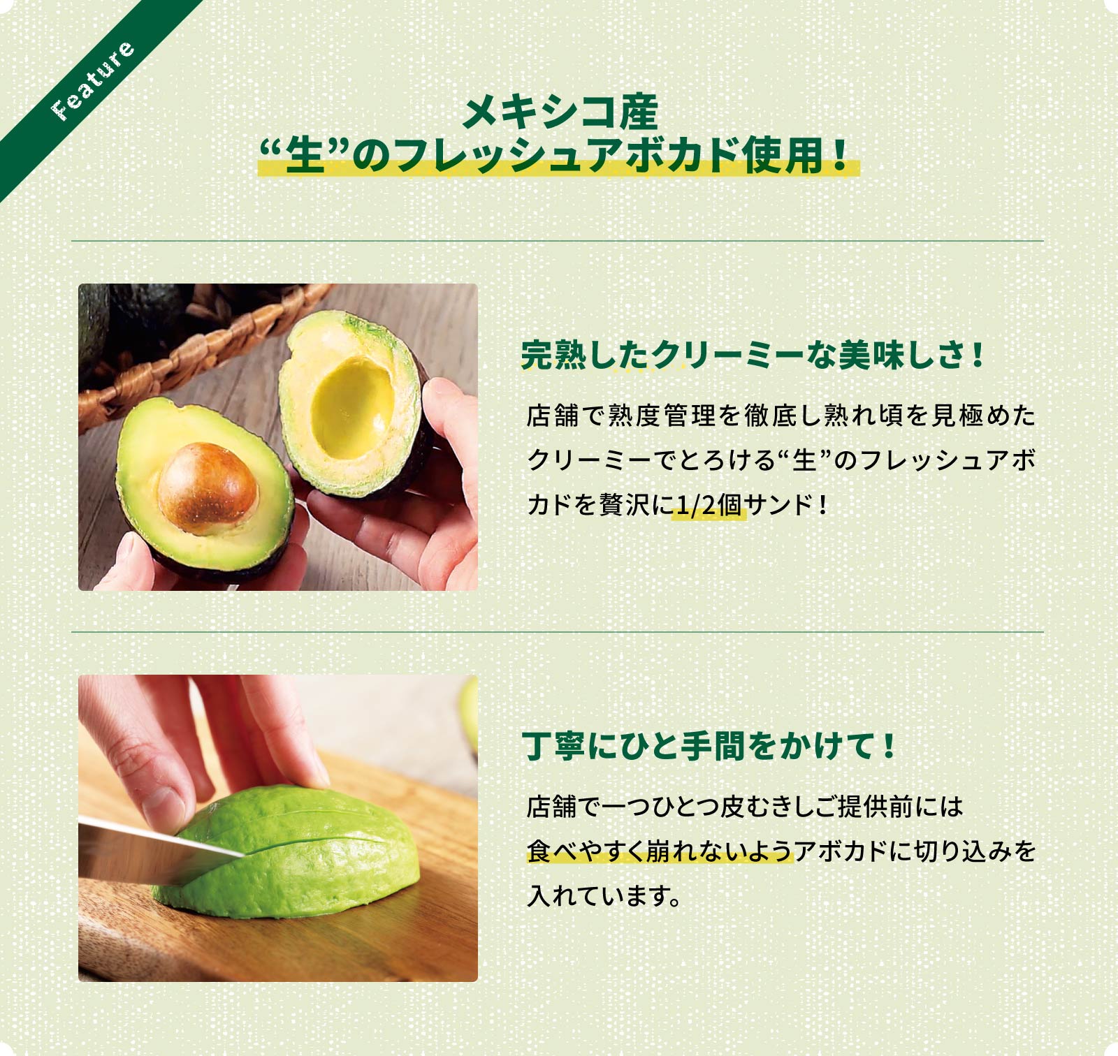 CLASSIC AVOCADO BURGER クラシックアボカドバーガー 850 あふれる肉汁と肉のうまみお肉は通常サイズの2倍以上のボリューム!「生」アボカドを贅沢に1/2個サンド。アボカドはビタミンや食物繊維等、体に嬉しい栄養素が豊富なことで「スーパーフード」とも呼ばれています。店内で一つ一つ手作業で皮を剥き、丁寧に仕上げたこだわりのハンバーガー。※お肉のサイズは当社レギュラーバーガー比 ※金額は税込価格となります。※イートインとテイクアウトの価格について、「税込同一価格」となるようイートインの税抜価格を値引しております。※空港や商業施設、球場など一部店舗ではセット内容・商品内容・価格が異なる場合がございます。※一部店舗で企画やメニュー検証を行っている場合、商品内容や価格が異なることがございます。※一部商品は店舗によって取り扱いがない場合があります。※画像はイメージです。※商品の一部を予告なく変更・終了する場合がございます。あらかじめご了承ください。 Share PrevクラシックチーズバーガーNextクラシックアボカドチーズバーガー 全てのハンバーガー 全てのメニュー アレルギー情報 原産地情報 栄養成分情報